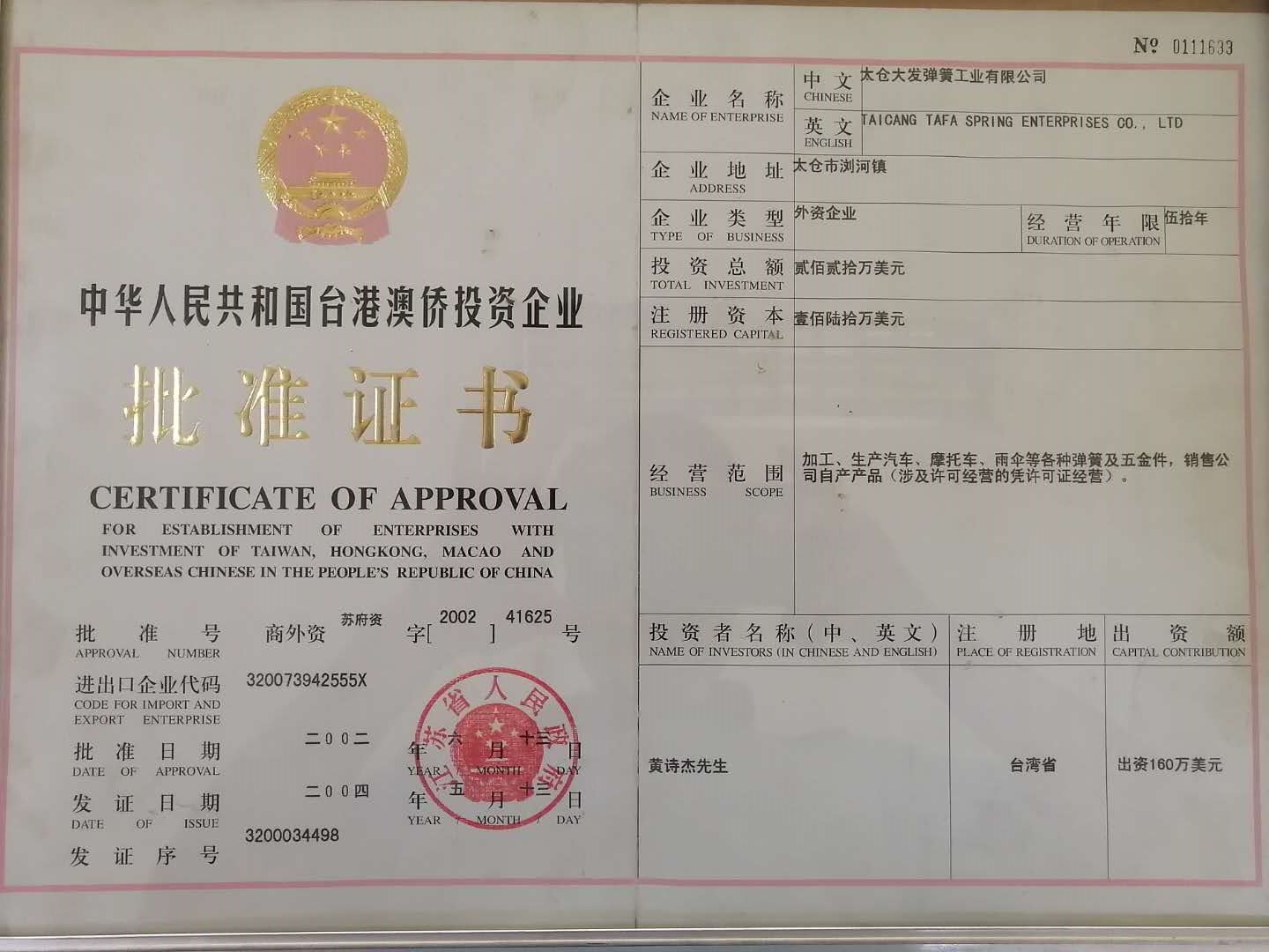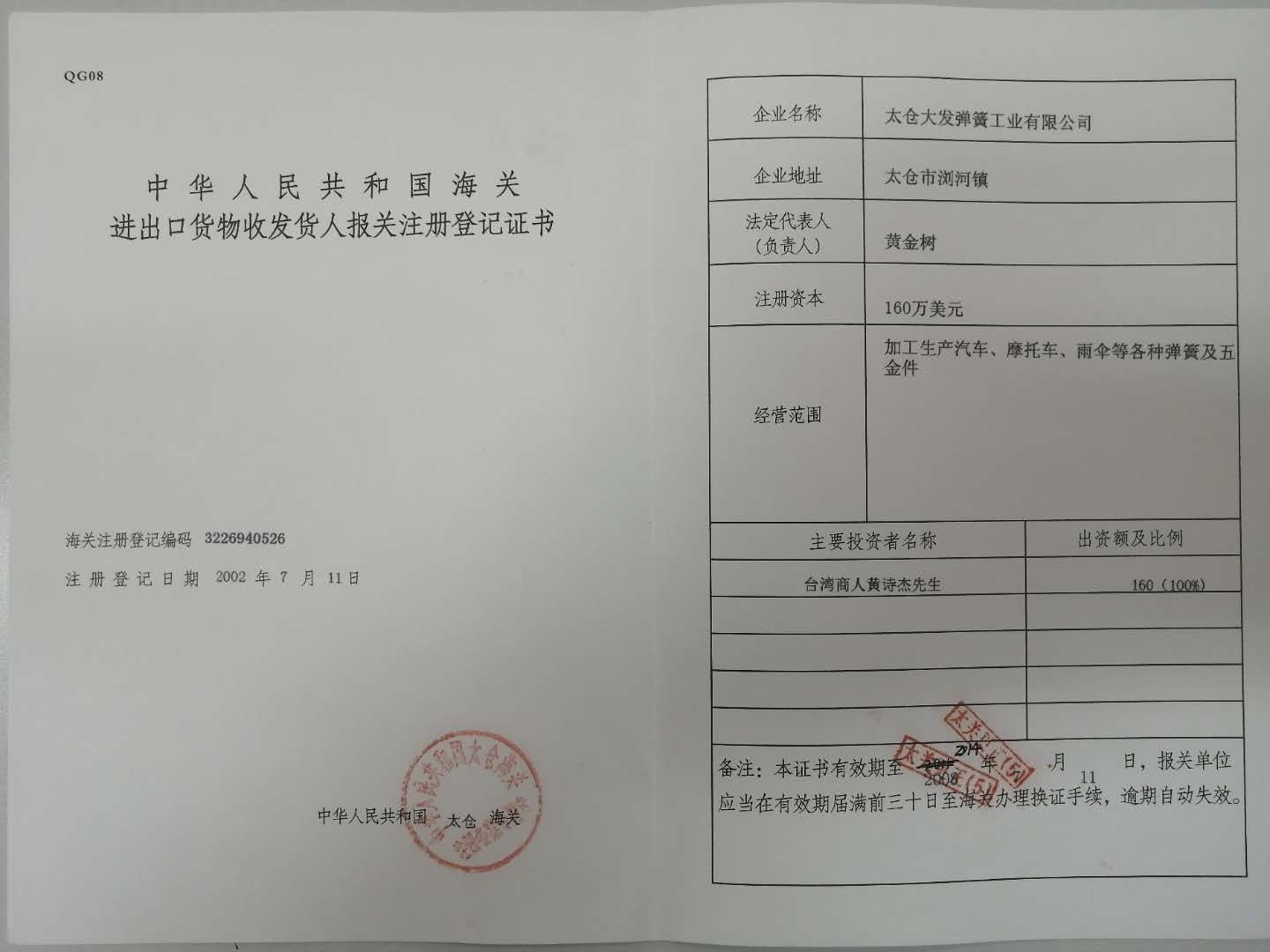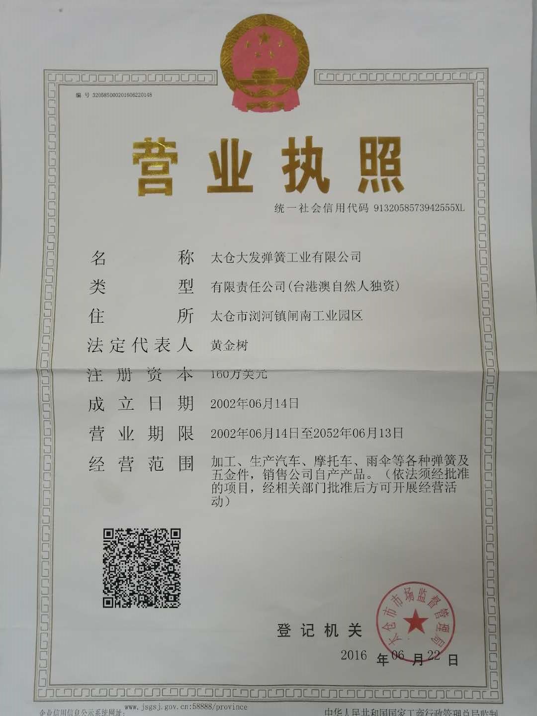 太倉(cāng)大發(fā)彈簧工業(yè)有限公司由黃金樹(shù)先生于1967年始創(chuàng)于臺(tái)灣,是一個(gè)集雨傘、電子、五金機(jī)械、自行車、摩托車、汽車等的彈簧配件生產(chǎn)、加工、輔助設(shè)計(jì)服務(wù)的綜合性企業(yè),其中1990年創(chuàng)辦的廈門(mén)大發(fā)彈簧公司、2000年創(chuàng)辦的深圳大發(fā)彈簧公司、2002年創(chuàng)辦的太倉(cāng)大發(fā)彈簧公司均位于經(jīng)濟(jì)發(fā)展地區(qū),地理位置佳。我們憑借在彈簧制造業(yè)的多年豐富知識(shí)與技術(shù),并著眼于以客戶為導(dǎo)向,秉持“以人為本,以質(zhì)為先,以客為主,持續(xù)創(chuàng)新”的經(jīng)營(yíng)理念,強(qiáng)化競(jìng)爭(zhēng)優(yōu)勢(shì)。公司導(dǎo)入ISO9001: 2000質(zhì)量管理體系,執(zhí)行ISO14000:2000管理方式,倡導(dǎo)安全、高質(zhì)量、高素質(zhì)的生產(chǎn)。